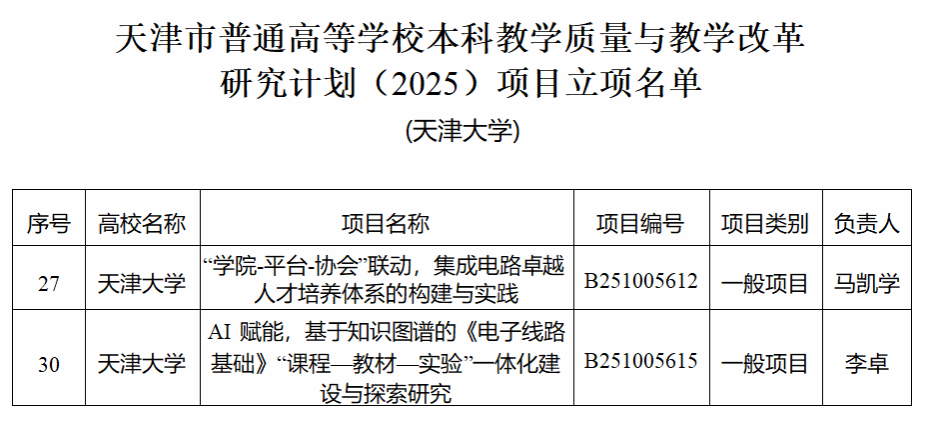 本站讯(通讯员:石惠)近日,天津市教育委员会相继发布首批天津市级普通高校新形态教材建设项目及2025年天津市本科教学质量与教学改革研究计划项目立项名单,性视频 申报的4个项目全部获批立项,其中《系统级芯片(SoC)设计》《电子线路基础》获批新形态教材建设立项、《“学院-平台-协会”联动,集成电路卓越人才培养体系的构建与实践》《AI赋能,基于知识图谱的〈电子线路基础〉“课程—教材—实验”一体化建设与探索研究》获批本科教育教学改革项目立项。